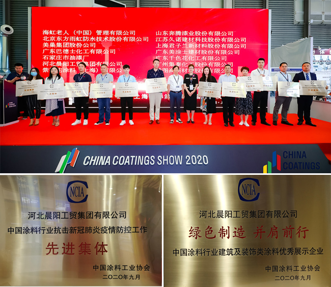 因在疫情防控期間的突出的擔當及貢獻,在2020中國國際涂料博覽會授牌儀式上,河北晨陽工貿集團榮獲“中國涂料行業(yè)抗擊新冠肺炎疫情防控工作先進集體”及“中國涂料行業(yè)建筑及裝飾類涂料優(yōu)秀展示企業(yè)”兩項榮譽。
