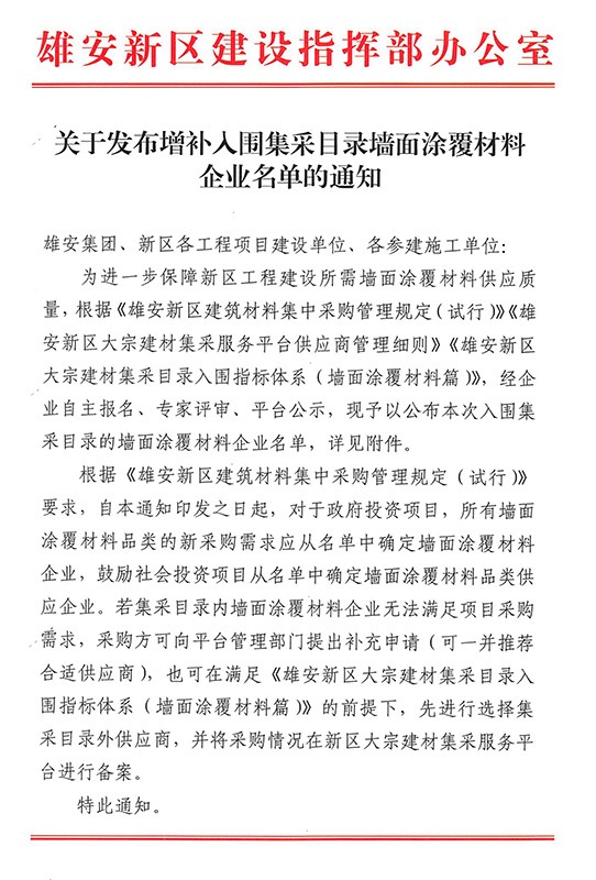2022年8月9日,雄安新區(qū)建設指揮部辦公室發(fā)布了《關于發(fā)布增補入圍集采目錄墻面涂覆材料企業(yè)名單的通知》。據墻面涂覆材料企業(yè)入圍名單顯示:河北晨陽工貿集團有限公司(以下簡稱“晨陽水漆”)共計有15款內外墻環(huán)保水漆產品入選。